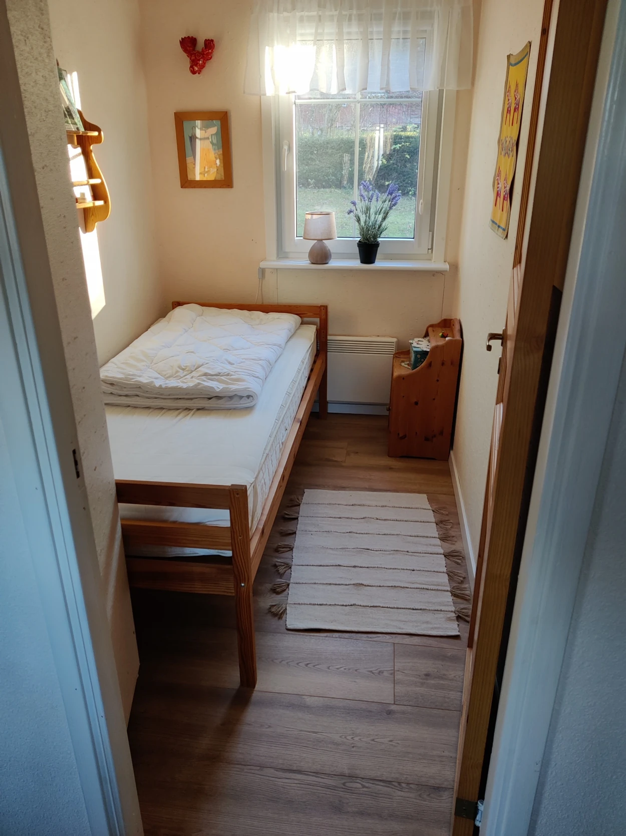 Dieses kleine, liebevoll gestaltete Einzelzimmer eignet sich perfekt für Einzelschläfer oder als Rückzugsort für Kinder und Jugendliche. Das Holzbett bietet eine bequeme Schlafmöglichkeit, während die freundlichen Farben und die liebevolle Dekoration für eine heimelige Atmosphäre sorgen.